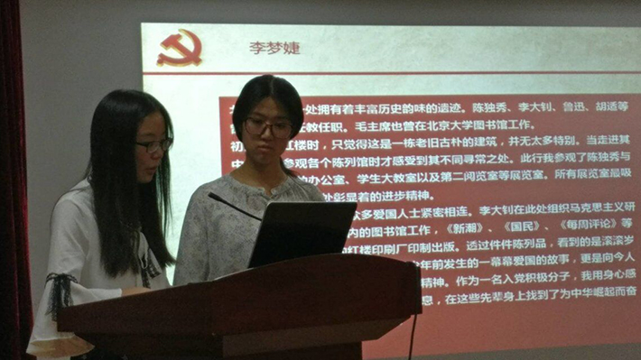 当晚八点,支部成员聚集在后主楼914,以PPT展示的形式对所参观的内容进行展示讲解并分享自己的参观感受。参观北大红楼的成员们谈到了历史名人如陈独秀、李大钊、鲁迅和胡适等人,激励我们保持革命情怀,心怀五四精神,永远做正直的、有先进思想的一代青年;参观圆明园的同学们回顾了圆明园修建的历史,带领我们回味这座万园之园的当年绝代风采,同时以“圆明园被英法联军毁坏”的历史警戒我们要牢记“落后就要挨打”的教训,努力发展自身,强大自身实力;去中国国家博物馆参观的同学们则为我们带来一张张历史瑰宝的照片,联系当代“一带一路”的国家方针,着重介绍“复兴之路”的历史意义,让我们受益匪浅;最后由参观李大钊故居的同学们为我们介绍了历史名人李大钊的事迹,鼓励我们学习革命精神,为祖国的繁荣昌盛作出自己的努力。