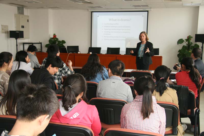 师生主持了题为“Incorporating Drama into the Classroom”的工作坊。这次工作坊主要关注戏剧在外语教学实践中的应用。在Janet Raskin 女士的带领下,大家参与和设计了一系列生动有趣的课堂戏剧活动,从中体会到了戏剧可以帮助语言学习者消除焦虑,提高积极性,增强语言能力。这次工作坊形式多样,内容丰富,师生共同参与合作,迸发出许多精彩的火花。最后,Janet Raskin还结合自己多年的教学和研究经验,耐心细致地回答了大家的问题。