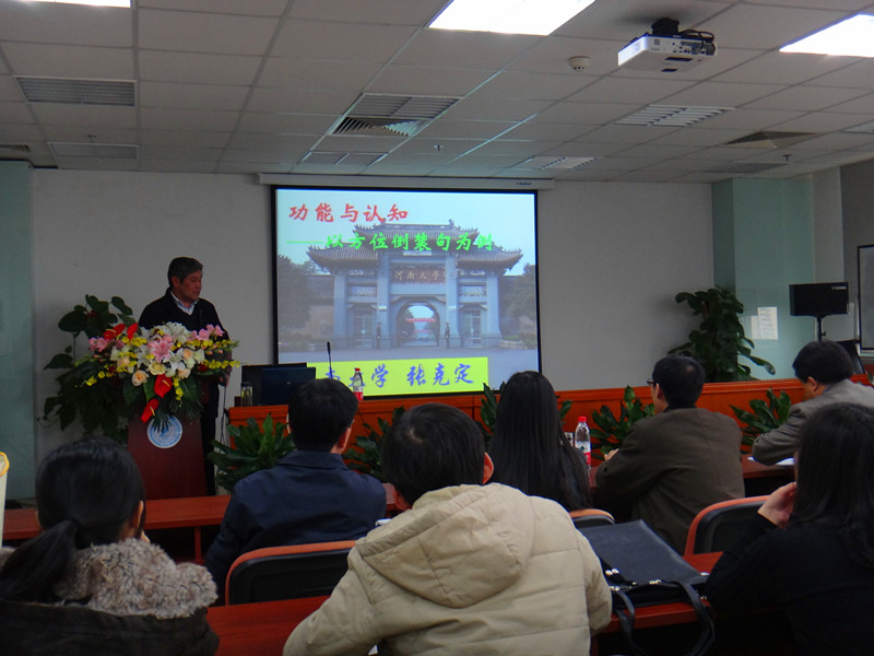 启动仪式上,苗兴伟老师介绍了本次学术活动月的活动流程以及系列讲座的主题。紧接着,院长程晓堂教授为本次活动致辞。随后,河南大学张克定教授以“功能与认知——以方位倒装句为例”为题进行了讲座,拉开了本次学术月活动的序幕。张克定教授从功能与认知的角度解释了方位倒装句的功能,并提出语言研究要注重各领域间的连贯,不能拘泥于研究的某一领域,应打通不同学科研究领域间的联系。最后,张克定教授就同学们的疑问作出解答。