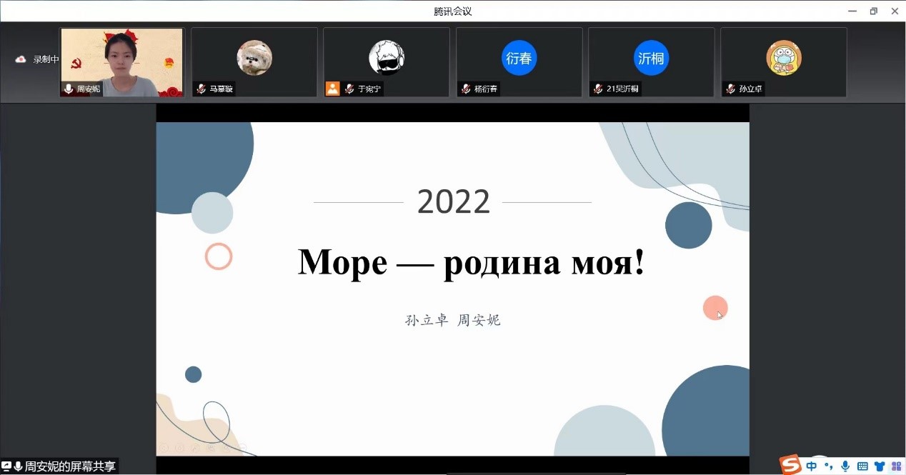 2020级研究生孙立卓和2021级研究生周安妮以 Море - родина моя为主题,从二人家乡均为沿海省份的共同点出发,分别向大家展示了自己家乡的特色文化,祝愿祖国繁荣昌盛。穆新华老师和刘娟老师从培养家国情怀、弘扬传统文化的角度点评了本次展示,向本科生同学提出了努力的目标。
