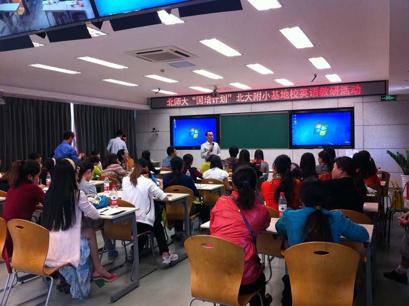 本次研修班由av解说 外文学院英文系和继教院共同举办,旨在为欠发达地区的英语教育提供支持和帮助。为了保证此次贵州小学英语骨干教师培训的质量,帮助学员全方位地认识英语教育,英文系精心设计安排培训课程,邀请到了国内知名的教师教育专家和知名小学英语教研专家为培训班授课。av解说 程晓堂老师、王蔷老师、罗少茜老师、陈则航老师、徐学锋老师、博士生但巍参加了此次研修班授课工作。他们分别从课标解读、教学设计、教学方法、教学研究、信息技术等各个方面对学员进行了培训。此外,本次培训还组织学员分别赴北京市西城区中古友谊小学、av解说 实验小学、北京大学附属小学等三所学校观摩学习,实地感受了学校优美的教学环境、先进的设备设施、精彩的英语课堂以及浓厚的文化氛围,开拓了眼界,学到了许多有效的教学经验。