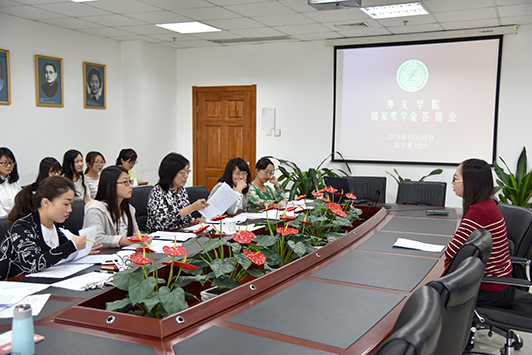 2015年10月15日,在学院的组织和安排下,外文学院在后主楼1020会议室举行了2015年本科生国家奖学金评选答辩会,17名获得答辩资格的同学到场进行了答辩。刘娟、郭乙瑶、王志松、于晖、武玉红、张新颖等老师以及2014级硕士研究生钟馨愉担任此次答辩会的评委。