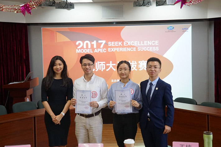 通过本次Model APEC高校选拔赛北师大赛区,让我们领略到许多北师大优秀学子的风采。选手们自信的台风和成熟的观点表达着实体现了“学为人师,行为世范”的校训。本次选拔赛,郭贝思女士,曾获得Model APEC大会2016年中国区选拔冠军的张文凯学长,英文系主任王楠老师、孙晓慧老师以及英文系外教Chris Ott应邀出席并担任评委工作。