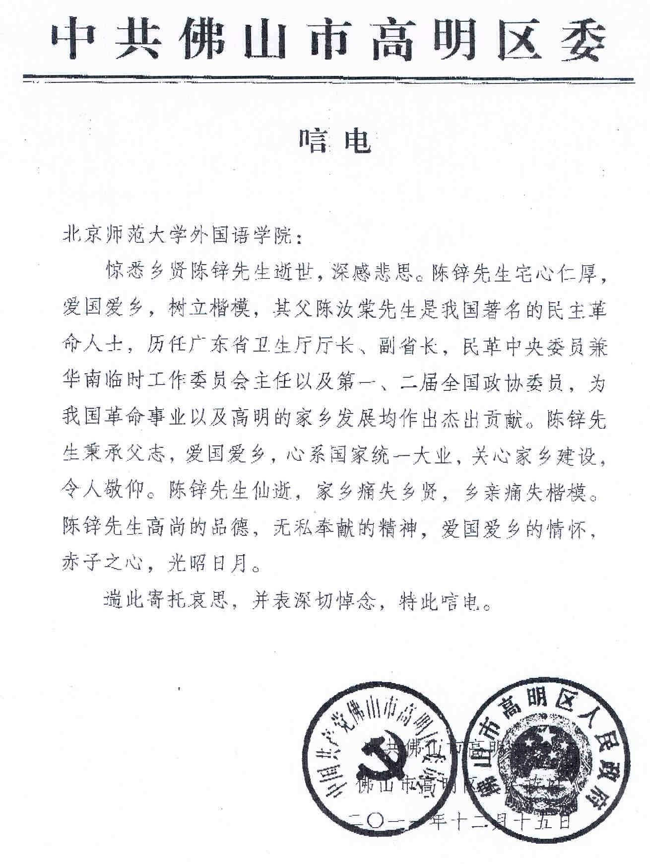 陈锌教授的逝世是外文学院的一大损失,我们会继承教授的未竟事业,发扬教授的优良品格,为办好外文学院努力奋斗,以优异成绩迎接明年外语学科创建100周年。