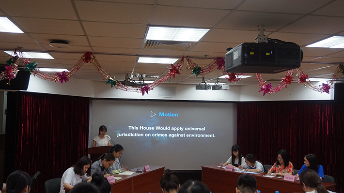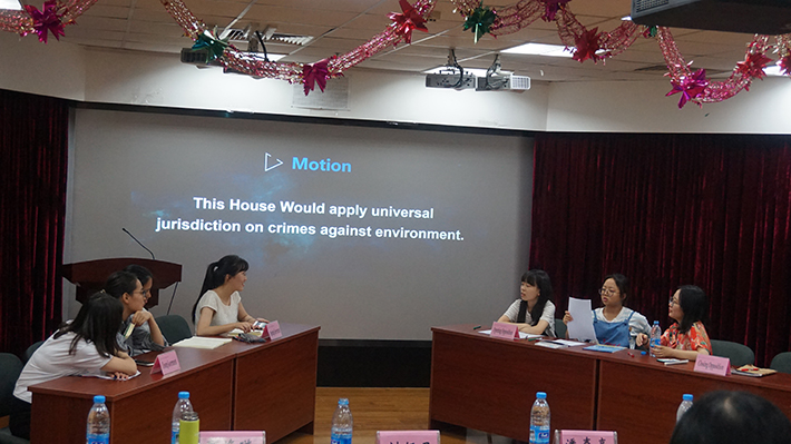 决赛中,辩手们围绕辩题“This House Would apply universal jurisdiction on crimes against environment”展开激烈辩论。正方上院认为全球性的法律体系可以合理的利用资源,最高效地追捕逃犯,也能促进国际间的合作。反方上院则针锋相对的对正方上院所说的法律漏洞提出质疑,并指出不同国家的发展和环境问题的情况均不一样,应当因人而异,全球性的法律是没有必要的。不过正方下院却认为,环境问题是全球性且十分重要的问题,相比环境,经济发展的问题都不重要,所以对于环境问题,全球性的法律是很有必要的。同时,反对党下院另辟蹊径,巧妙地提出,不同国家的发展情况不同,对环境状况的治理水平也不同,如果应用全球性的标准,对于大国来说,不就有理由少治理多污染了吗。辩手们你来我往,在紧张而激动人心的辩论中体现思维的差异,擦出思想的火花。