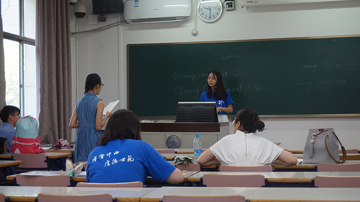 在比赛正式开始前的19日晚6点,举行了一场针对外文学院英 文BP辩论赛的专题培训和样赛,由辩论队队长刘妍君主持。该培训不仅为参赛辩手们解答了赛制流程上的疑问,其样赛更是帮助辩手们提前进入比赛的氛围。