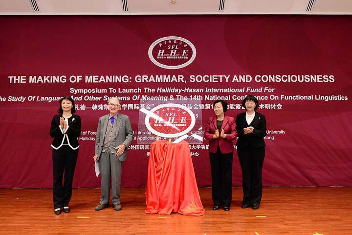 基金成立仪式上,刘川生书记、张雪书记、田立新司长与韩礼德教授共同为“韩礼德—韩茹凯语言学国际基金”成立揭牌。
