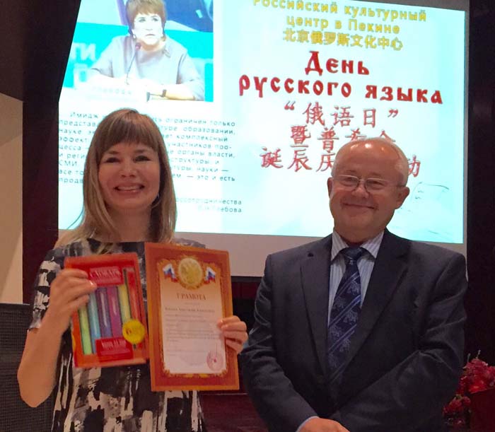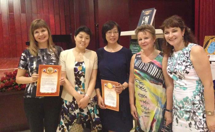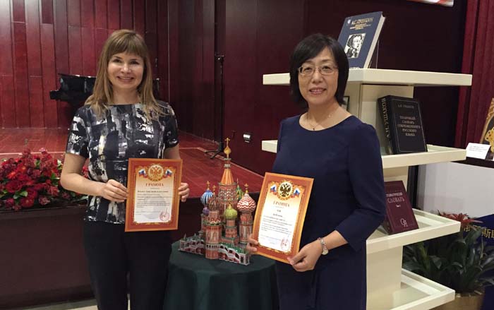 2015年6月5日、9日,刘娟教授、穆新华副教授、俄文系俄籍专家娜斯嘉受邀参加北京俄罗斯文化中心“俄语日”系列庆祝活动,俄罗斯独联体事务、俄侨和国际人文合作署代表、俄罗斯联邦驻华大使馆参赞、北京俄罗斯文化中心主任孔诺夫为俄语系三位老师颁发荣誉证书和奖品。这些奖项由俄罗斯联邦政府颁发,由俄罗斯独联体事务、俄侨和国际人文合作署署长签发,旨在表彰为俄语国际化做出重大贡献的外国专家。