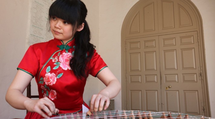 Musical entertainment: Four folk musicians from BNU provided traditional Chinese music. Here, one of the performers plays the guzheng, one of the most ancient Chinese traditional music instruments.