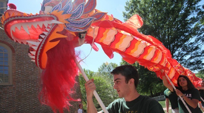 Dancing dragon: Following the celebratory lunch, a traditional dragon dance was performed in the Sunken Garden. Professional lion dancers and martial artists from Washington, D.C., were on hand to lead the parade while W&M students participated with a drum performance, a Yangge dance performance, a Tibetan dance performance and a Uygur dance performance.