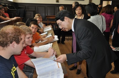 The grand opening schedule included a private tour of Rowe House, the home of the Confucius Institute at William & Mary, as well as a trip to the College Child Care Center to observe Mandarin language classes in action. A guided tour of Chinese scrolls and exhibits at Swem Library was led by Dean Carrie Cooper and Bea Hardy, director of the Special Collection Research Center, after which delegates witnessed a College Mandarin class in the Wren Building’s historic grammar school classroom.