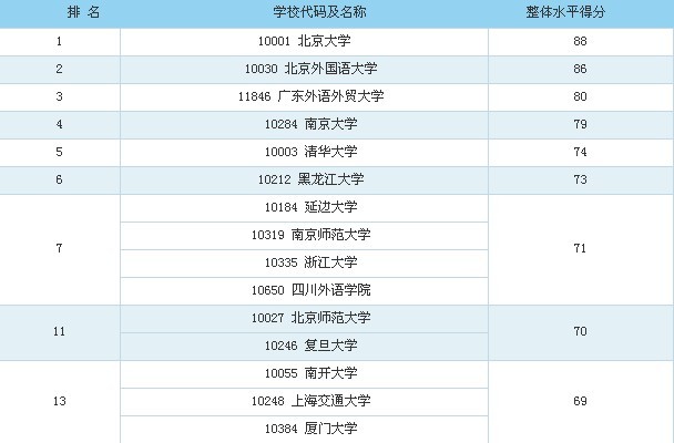 另外,根据武书连公布2013年度中国大学排名和各本科学科排名,av解说 外国语言文学一级学科排名第5,与2012年持平。2009年排名第7,2010和2011年排名第8。英语在2013年排名为第11,等级为A++,参评高校总数为570。