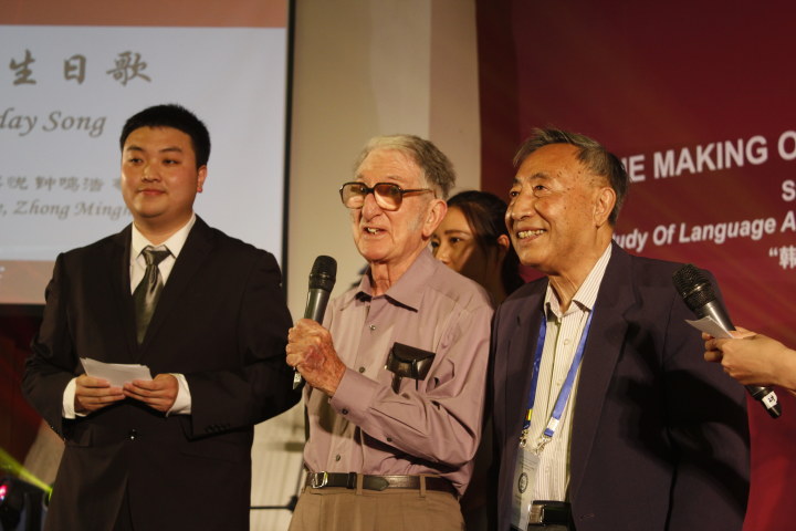 晚会现场,在一曲用西班牙语和葡萄牙语演唱的《生日歌》中,同学们将为韩礼德教授和胡壮麟教授精心准备的生日蛋糕推到台前并献上美好的祝愿,两位教授十分惊喜并现场分享了自己的心情和对同学们的感谢。祝寿环节后,晚会正式开始,当晚的节目异彩纷呈。古典舞《采薇》、踢踏舞《雷电》、管乐民乐精彩演奏、歌曲串烧等节目精彩层出不穷,而表演人员既有外文学院学生和留学生,也有功能语言学学会的专家学者,主持人张萌也倾情献唱,而外文学院党委书记林洪老师的一曲《攀登高山》将晚会推向了高潮。
