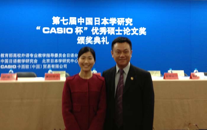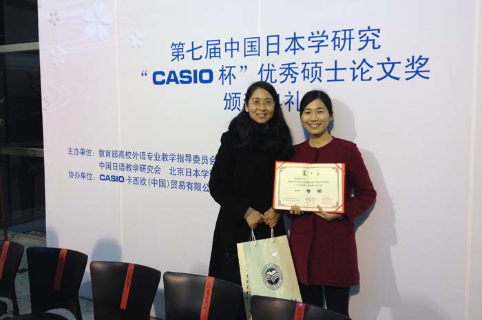 2014年11月6日,第七届中国日本学研究“CASIO杯”优秀硕士论文奖颁奖典礼在北京日本学研究中心举行。日文系2014届硕士生毕业生赵立翠同学的硕士论文《关于中国高级日语学习者词语搭配的心理表征与心理加工的研究-兼与日语本族语者对比(中国人上級日本語学習者のコロケーションの心的表象と心的処理に関する研究―日本語母語話者と対比しながら―)》,斩获“语言类”一等奖(仅设1名)。同时,其指导教师林洪老师获得优秀论文指导奖。此前,日文系硕士生也曾先后获得过一次二等奖和三等奖,获得一等奖尚属首次。
