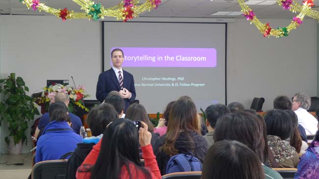 讲座由北师大外文学院教师David L. Chiesa主持,上午的第一场讲座从9点开始。主讲人Dr. Christopher Hastings做了“Storytelling in the Classroom”的主题分享。他结合自身教学经验,介绍了许多storytelling中可使用的教学活动,并分享了许多storytelling的有效网络资源。第二场讲座主讲人CLaura Connor女士与大家分享语法教学的新方法,并现场逐一示范。例如,她邀请多位与会者作为学生代表,组成4个小组,让小组每位成员参与不同小组的故事编写,并在每个活动环节解释具体实施的要点,引起教师们的热烈响应。第三场讲座Jim Radebaugh给我们分享了“Encouraging Student-to-Student Interaction in the Language Classroom”这一主题,并通过邀请几位附小的学生向我们真实地展现了如何让激励课堂上学生间的互动。第四场讲座主讲人Christopher Tebbe介绍了如何在语言教学中有效利用小组活动促进学生学习运用英语,主要介绍了问卷、调查、合作听写等小组活动,邀请与会者全程参与,激起了在场观众的参与的兴趣,将本次系列讲座推向高潮。