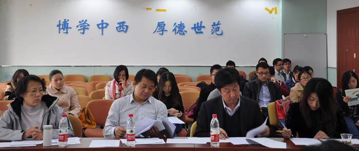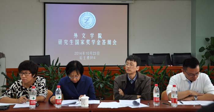 2014年10月23日,在学院的精心组织和安排下,外文学院在后主楼914会议室召开了研究生国家奖学金答辩评审会,外文学院分党委书记林洪,分党委副书记武玉红,副院长刘娟,副院长苗兴伟,分团委书记张新颖,日语系王志松、宛金章,英文系教师张政、章燕、蒋虹、彭宣维以及博士学生代表赵连杰担任了此次答辩会的评委。