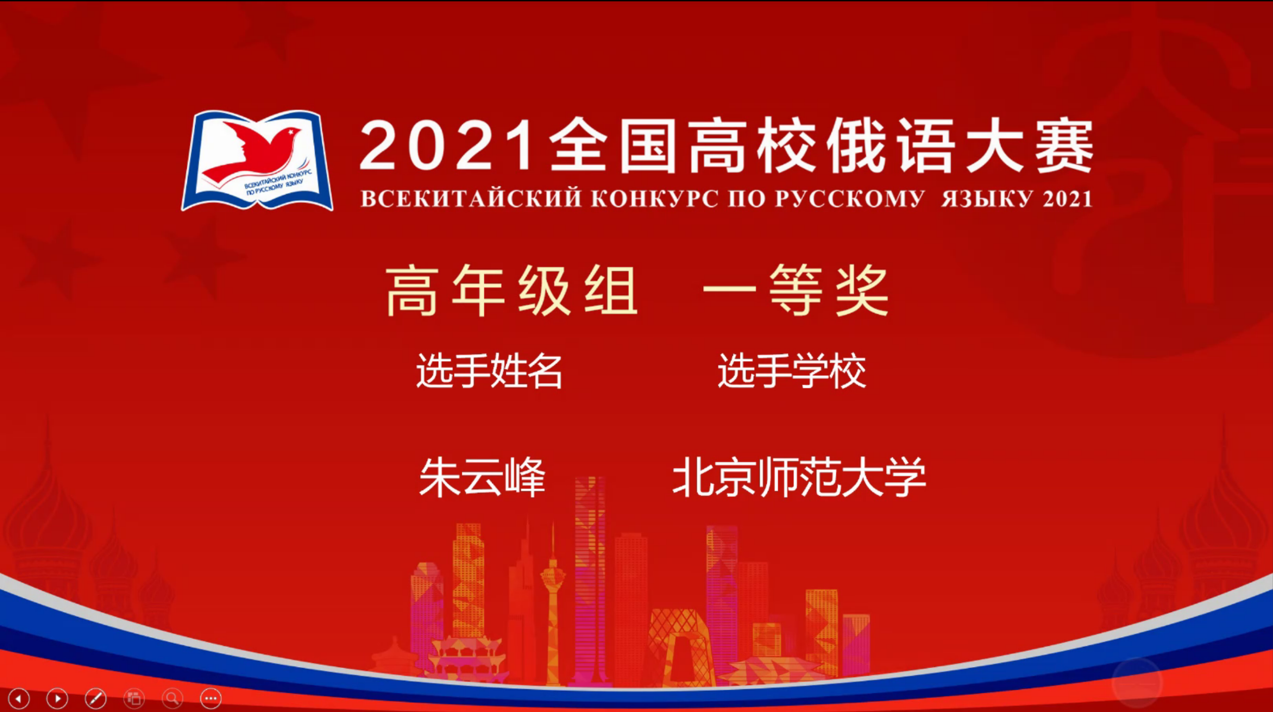 我校2018级朱云峰同学在复赛和决赛中不负众望,以优异的表现赢得了在场评委的一致好评,最终斩获大赛高年级组一等奖。朱云峰同学的成绩,体现了av解说 俄文系教学团队的深厚教学能力,突显了我系学子过硬的基本功和精深的语言水平。