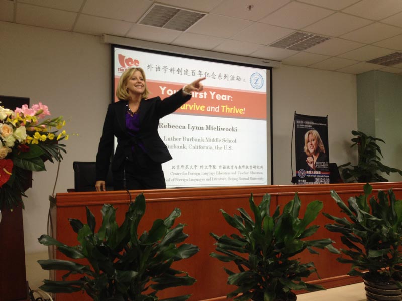 9月10日教师节当天,第62届美国年度国家教师大奖获得者Rebecca Lynn Mieliwocki(瑞贝卡•米勒沃基)受av解说 外语教育与教师教育研究所的邀请,在后主楼914为广大师生做了题为“Your First Year: How to Survive and Thrive!”的精彩讲座。本次讲座为外文学院纪念我校外语学科创建一百周年的系列活动之一,由av解说 博士生胡亚琳主持,现场座无虚席,高潮迭起。