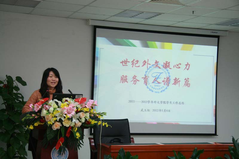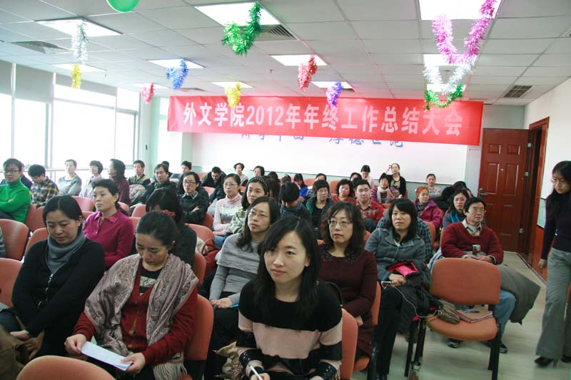 2013年1月4日上午在后主楼914学术报告厅,外文学院召开了2012年工作总结大会。根据外文学院全院大会制度(行使二级教代会职责),学院每学期召开1-2次全院大会,听取学院党政工团等部门的工作汇报,交流相关信息。该项工作已经实施了10年以上。