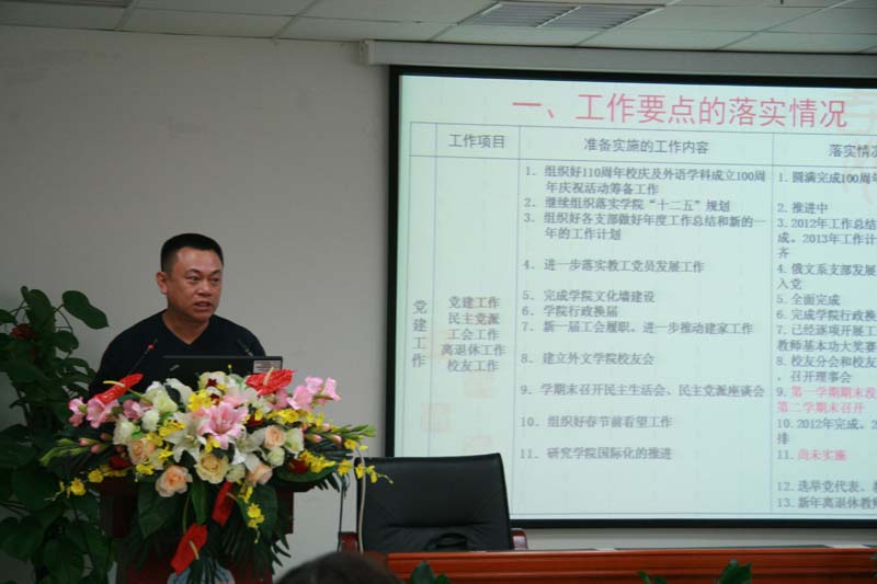 程晓堂从人才培养、科学研究、学科建设、队伍建设、对外交流与合作、财务收支情况等方面报告了学院一年来所取得的成绩以及面临的问题。提出了2013年的主要工作:人员补充工作以及外教聘任工作、落实985项目任务、落实北京市重点学科建设任务、大学英语教学改革试点工作、青年教师暑期国外进修工作、本科教学质量提升与教学改革工作、制度建设等。他特别提到了学院教师承担班主任的工作,希望得到全院教师的支持,并准备出台相关规定。