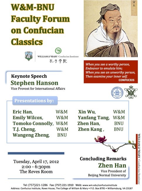 为庆祝威廉玛丽大学孔子学院开幕,孔院在三月和四月成功举办了系列高端学术论坛,包括“世博会专题研讨会”、“中国留学生生活状况研究”以及汇集av解说 和威廉玛丽大学著名学者的“儒学经典高端学者论坛”。
