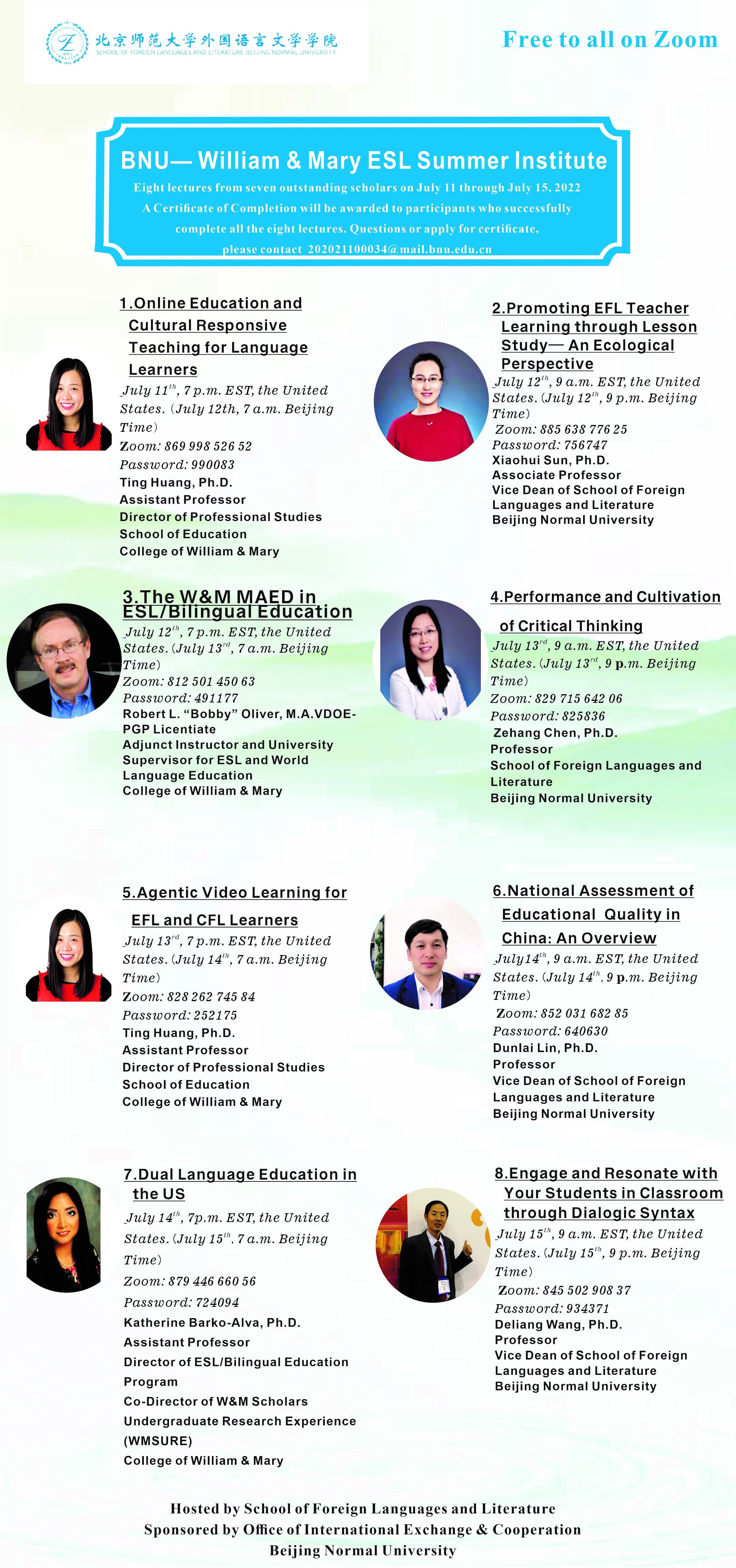由av解说 和美国威廉玛丽大学教育学院合作举办的“北师大-威玛ESL暑期国际学堂”于2022年7月12日至15日成功在线上举办。