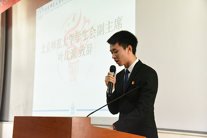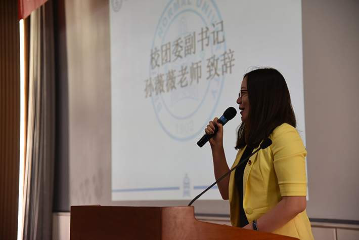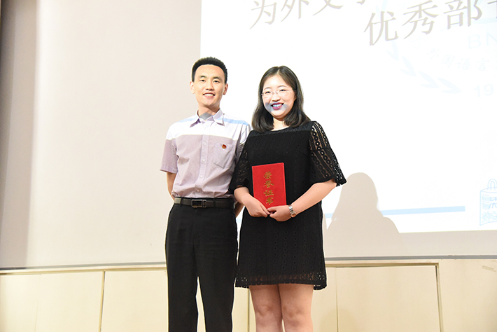 会议在庄严的中华人民共和国国歌声中拉开了序幕。随后,校团委副书记孙薇薇老师、院分党委书记刘娟老师、校学生会副主席叶江源同学分别为大会致辞。在致辞中,三位嘉宾回顾了外文学院在过去一年里的团学工作中取得的优异成绩,肯定了外文学生干部们认真踏实的工作态度,鼓励并祝愿外文学院在接下来的一年里再创佳绩。随后,外文学院分团委副书记楚帆、外文学院学生会主席苏培丹、外文学院研究生会主席叶施宏分别向大会作了2016—2017学年度工作报告。她们简明清晰地总结了过去一年的工作成果,展示了在外文学子共同努力下所获得的优秀成绩。同时她们也指出了未来学生工作仍需努力的方向,并号召广大团员学生不断砥砺自己,发扬外文学院团委学生会积极进取,团结向上的优良传统。接着,院长苗兴伟老师对代表们的提案作出了详细的反馈和解答,幽默风趣的发言博得阵阵掌声,真诚有效的反馈体现了院领导对青年学生的人文关怀。最后,亓振华老师,张新颖老师分别为2016学年度研究生会和团委学生会的优秀部长们颁发荣誉证书,赞扬了他们这一学年来为外文学生工作作出的努力和奉献。