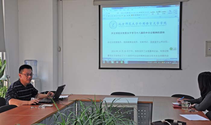 外文学院分党委委员会召开十八届四中全会《决定》学习会2014-11-052014年11月4日下午,外文学院分党委委员会在后主楼1006学术活动室召开学习会,集体学习《中共中央关于全面推进依法治国若干重大问题的决定》。学习会由分党委书记林洪主持。 学习会上,委... -